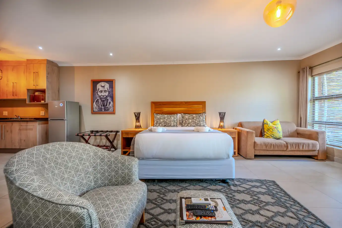 Pangolin is a stylish, self-catering unit designed for 2 guests. The open-plan bedroom features a king-size bed and en-suite bathroom with a shower. The kitchen includes all the essentials, while the living area offers air-conditioning, comfortable seating and a TV. Step outside onto the private balcony with table and chairs, perfect for morning coffee or an evening meal. A great choice for couples seeking comfort and convenience.